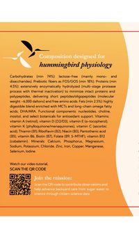 Grounded in 26 years of research and documented in a peer-reviewed publication with an assigned DOI, our formula is a complete food designed to meet real hummingbird nutritional needs beyond empty calories.